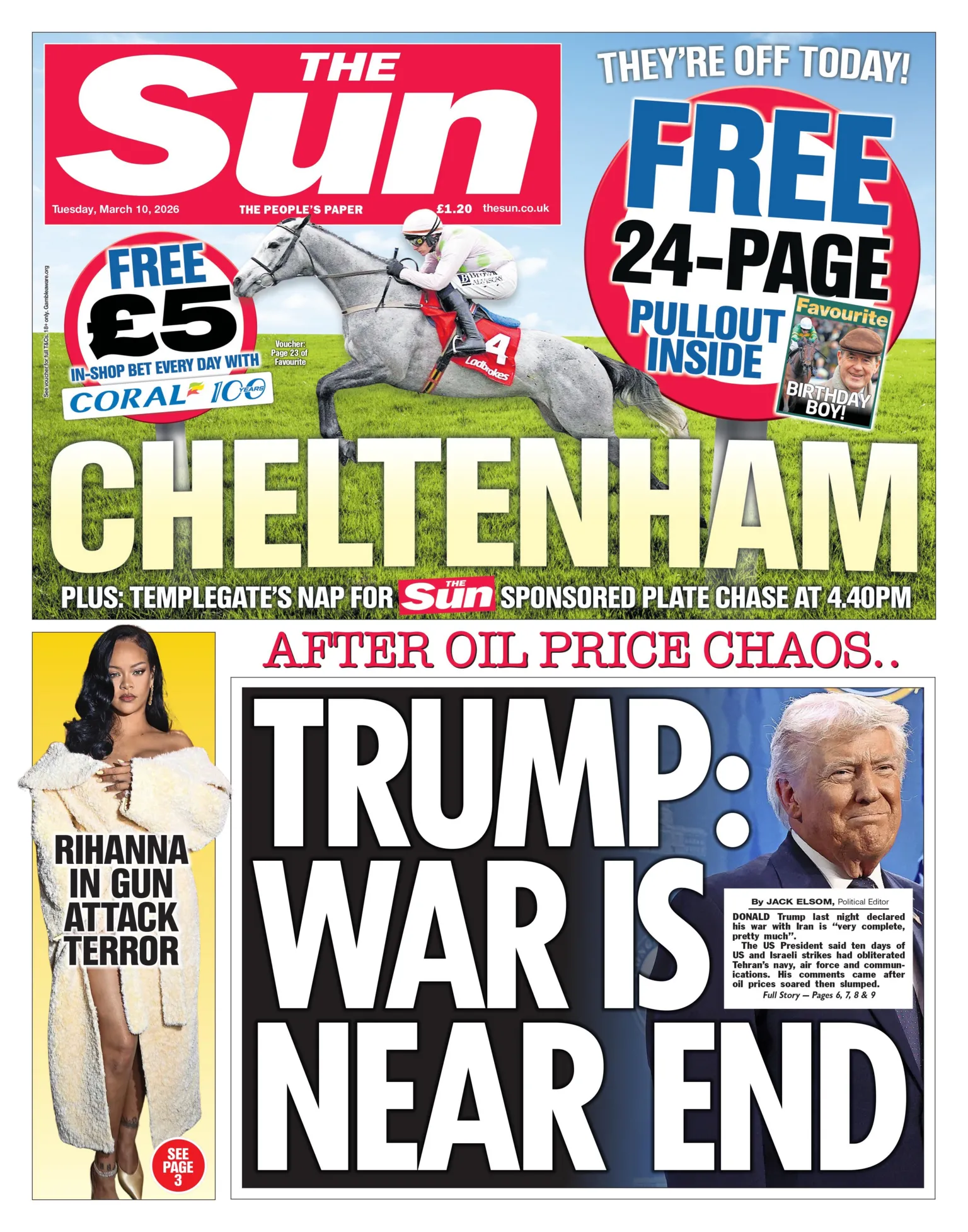 . The Sun's top story quotes Trump saying the Iran war is "very complete, pretty much". Ten days of US-Israeli strikes have "obliterated Tehran's navy, air force and communications", according to the US president.Trump's comments on a "very complete" war in Iran also lead the Daily Telegraph. With US defence officials saying the military is "very close to achieving its objectives" in the Middle East, the paper says the latest comments "lifted the stock markets". Meanwhile, the paper also writes schools and offices are being "urged to monitor anti-Muslim hostility" after the government released its social cohesion strategy. Communities Secretary Steve Reed "said the Government had a duty to act against record levels of hate crime against Muslims" in the Commons on Monday, the paper reports.The Times also leads with Trump's latest remarks that "Iran has nothing left and war is nearly over" adding: "British households told to brace for soaring costs with fears of petrol at £2 a litre". The front page also features a story on US researchers who found "taking a multivitamin every day in later life has been linked with slowing the ageing process by several months".