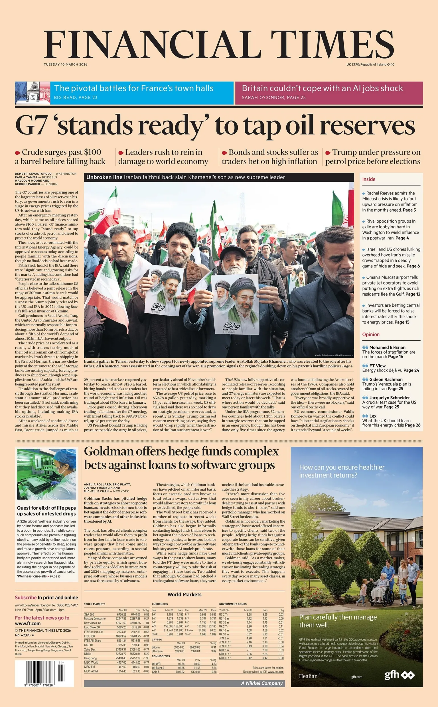 to protect UK households from cost of living shocks. Chancellor Rachel Reeves "vowed to help families... as the Iran war began to hit UK pockets", the Daily Mirror writes. Reeves' pledge to take "necessary decisions" comes after "oil prices reached a four-year high and energy bill fears grew"."Reeves has defied pleas to axe a punishing fuel duty hike amid fears petrol prices could hit £2 a litre," reads the Daily Express's top story."Reeves warns of cost-of-living rise as war on Iran hikes energy prices" says . It quotes the chancellor saying "rapid de-escalation" is "the best way to curb inflation". The paper splashes its own investigative journalism too, under the headline "UK's AI claims built on 'phantom investments'". Labour and Conservative government pledges to "turbocharge the economy" through deals with AI companies are questioned in the piece, including claims the deals would "build new datacentres, create thousands of jobs and construct a supercomputer". The paper says the Department of Science, Innovation and Technology did not respond to their questions but "rejected these assertions".