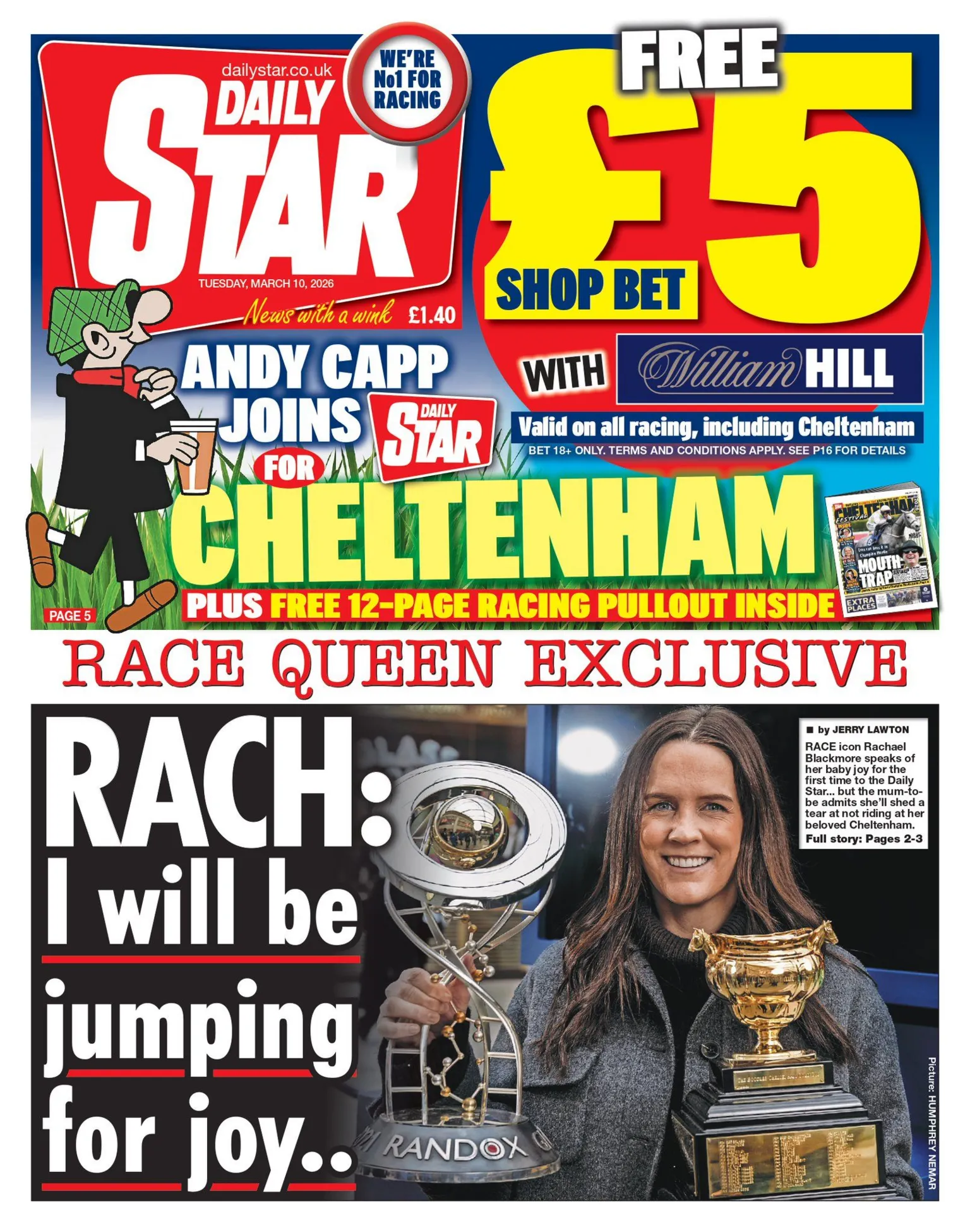 at this year's races. And finally, the Daily Star interviews jockey Rachael Blackmore ahead of the Cheltenham Festival. "I will be jumping for joy" at this year's races, Blackmore tells the paper.