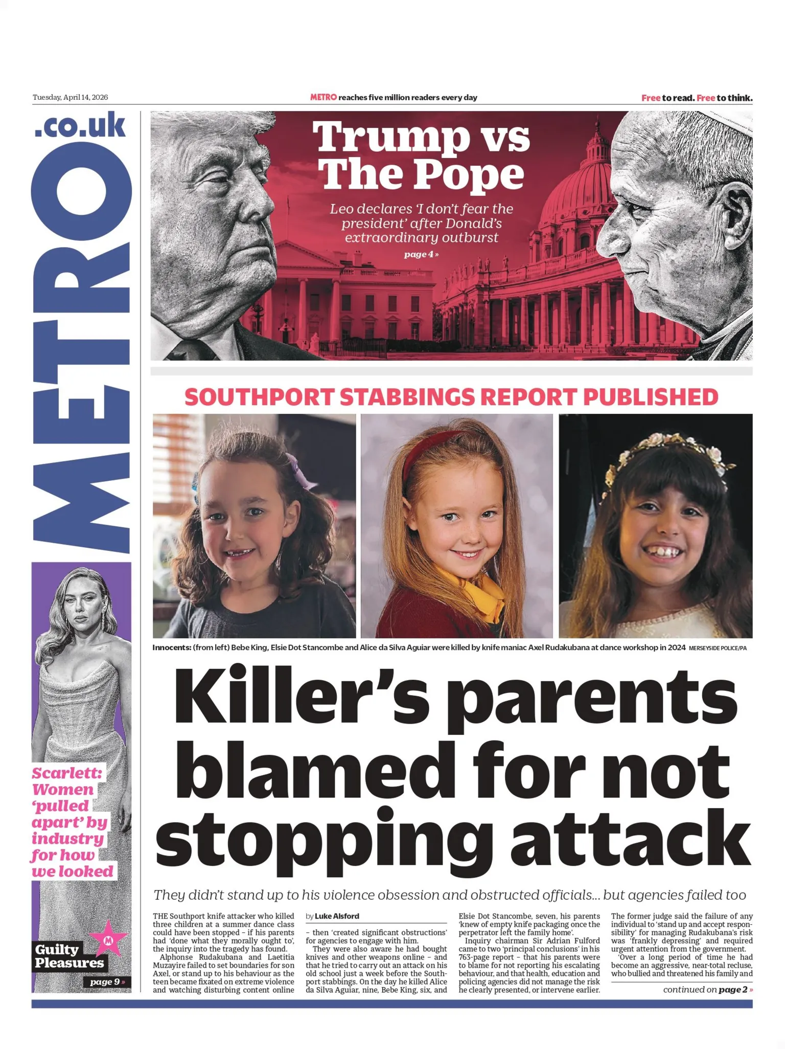 The Metro summarizes the inquiry's findings with the headline that the parents of Axel Rudakuban were "blamed for not stopping attack". It adds that the parents "didn't stand up to his violence obsession and obstructed officials... but agencies failed too".