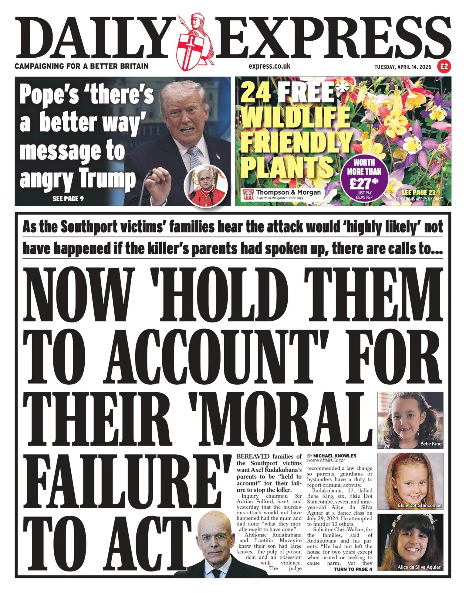 The Daily Express leads with calls from the bereaved families for Rudakubana's parents to be "held to account" over their failures "to stop the killer". The inquiry found the parents "knew their son had large knives, the pulp of poison ricin and an obsession with violence", according to the paper.