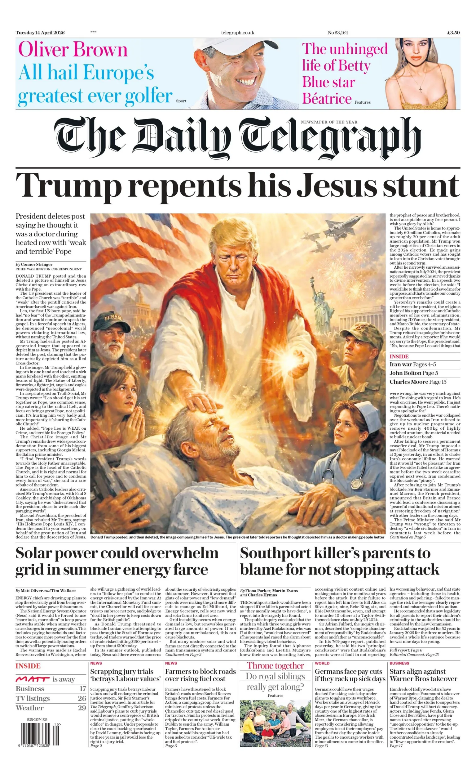 Several newspapers feature the story of President Donald Trump's deleted AI-generated image, which appeared to depict him as Jesus Christ. Trump claimed he thought he looked like a doctor in the image where he has his hand on the forehead of a sick man. The Daily Star uses a Monty Python reference for its headline,
