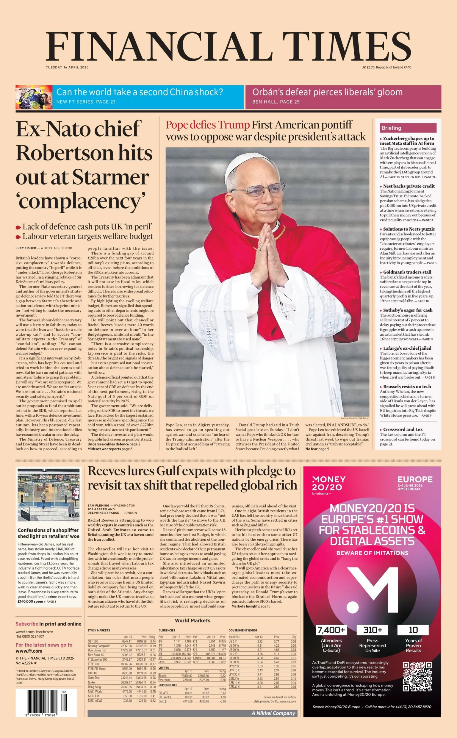 Lord George Robertson, former Nato Secretary General, criticized Britain's leadership for a "corrosive complacency" regarding defence, which is the lead story in the Financial Times. The paper describes his remarks as a "stinging rebuke" of the prime minister's defence policy.
