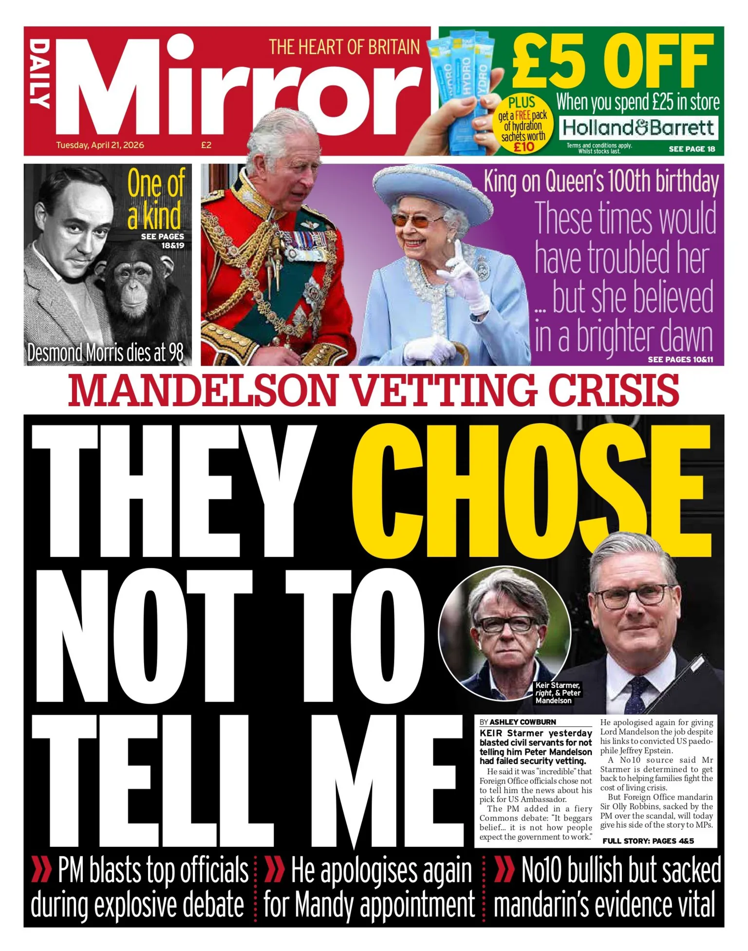 "Starmer claims officials deliberately kept him in the dark over Mandelson". Stephen Bush of the FT describes the scandal as revealing
