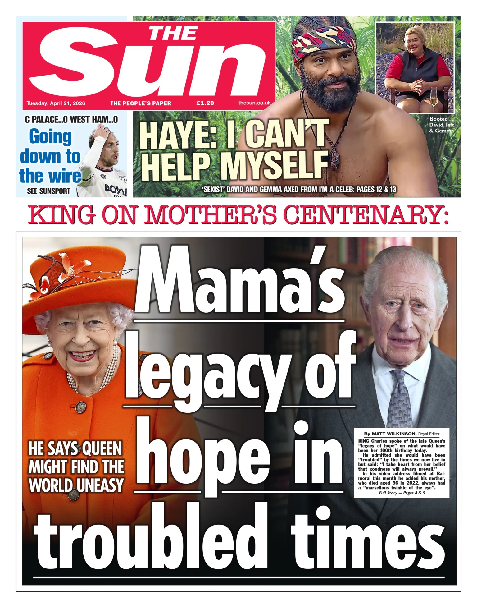 The Sun, along with several other papers, features a photograph of the late Queen Elizabeth on what would have been her 100th birthday. The Sun states that Britain continues to miss her