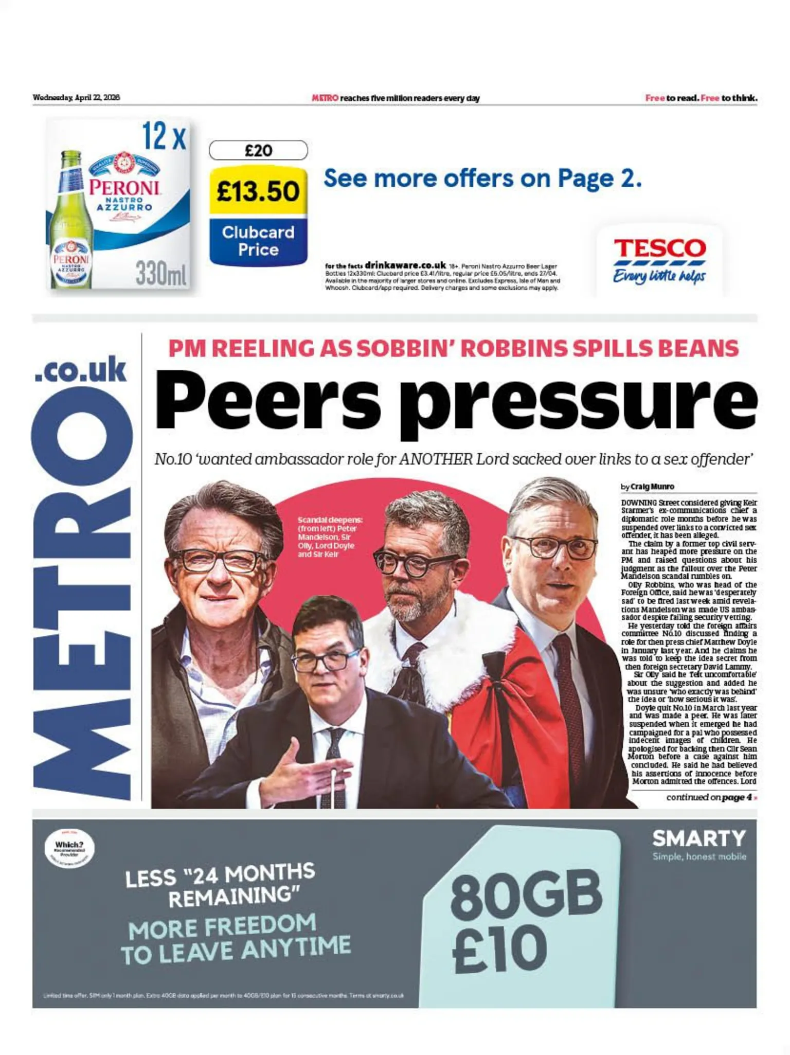 The Metro reports that the prime minister is "reeling as sobbin' Robbins spills beans". It notes pressure from peers, stating that No 10 sought an ambassadorial role for "another lord sacked over links to sex offender". Sir Olly revealed he was pressured to find a position for Sir Keir's former communications chief, Lord Matthew Doyle, who was suspended from the Parliamentary Labour Party earlier this year after it emerged he had campaigned for a friend charged with child sexual image offences. That friend was later convicted.