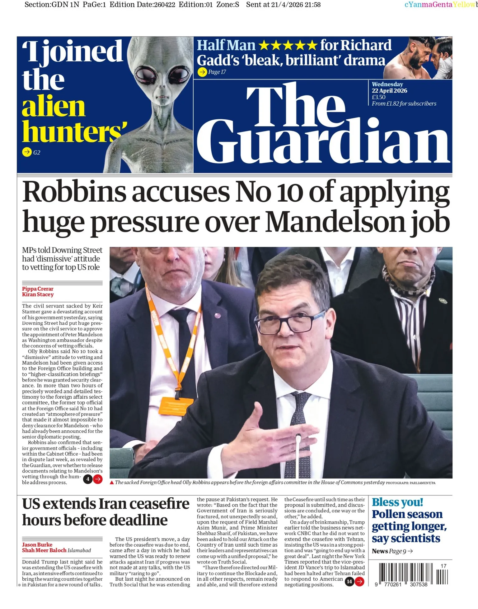 also leads with Sir Olly Robbins's testimony but includes news that the US has extended the Iran ceasefire hours before its deadline. It describes the day as one of brinkmanship for President Donald Trump, who had earlier told a US news outlet he did not want to extend the ceasefire.